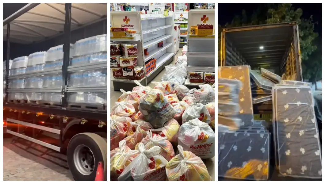 Em um dos pontos, ele mostrou a compra de todos os produtos de uma farmácia para envio ao povo gaúcho. "Enchendo o caminhão com produtos de higiene e remédios", escreveu ele em uma das publicações, exibindo prateleiras do estabelecimento vazias e os itens empacotados.