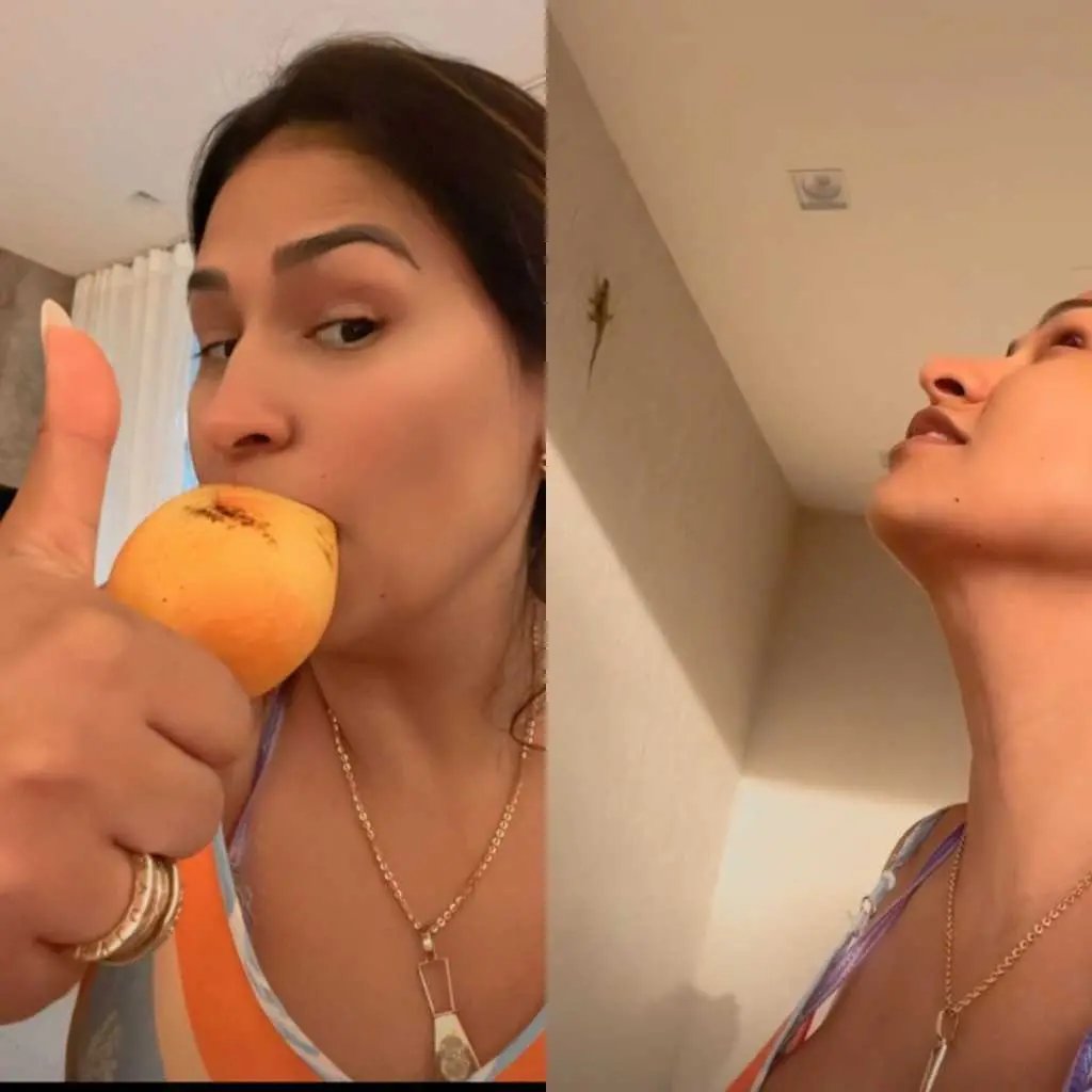 Nesta segunda-feira (19), no melhor estilo cearense, ela fez registros no Instagram chupando manga e até "conversando com um calango" (lagartixa).