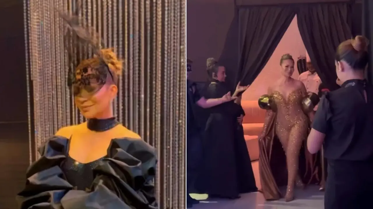 Além de máscaras, os convidados foram com looks all black. Com um traje ousado, a. dona da festa usou diferentes figurinos até o fim da festa, nas cores preto e dourado.