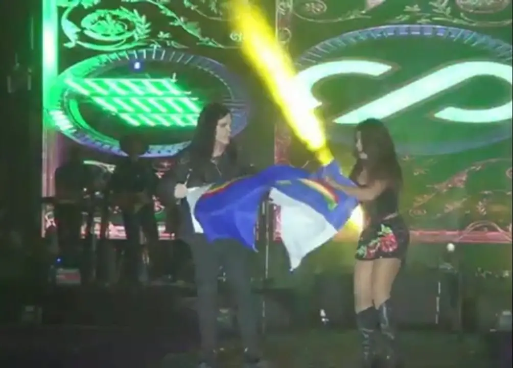 Silvânia Aquino estava cantando com Bell Oliver, outro vocalista da banda, quando um fã jogou a bandeira de Pernambuco no palco.