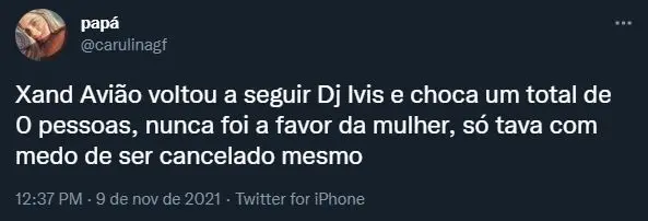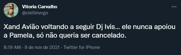 "Ele nunca apoiou a Pamella, só não queria ser cancelado", escreveu um usuário do Twitter nesta terça-feira (9). Na época da prisão, Xand afirmou, em vídeos divulgados nas redes sociais, que prestaria apoio à ex-mulher de DJ Ivis.