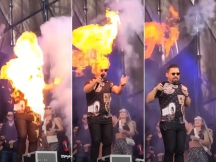 Em vídeo publicado nas redes sociais, é possível ver a chama atingindo o rosto e os braços do vocalista.