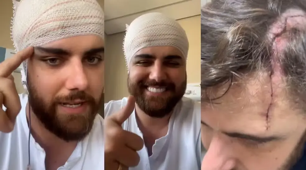 Em fotos na rede social, Zé Neto mostrou que o ferimento vai da sobrancelha até a parte de trás da orelha, passando por cima da cabeça.