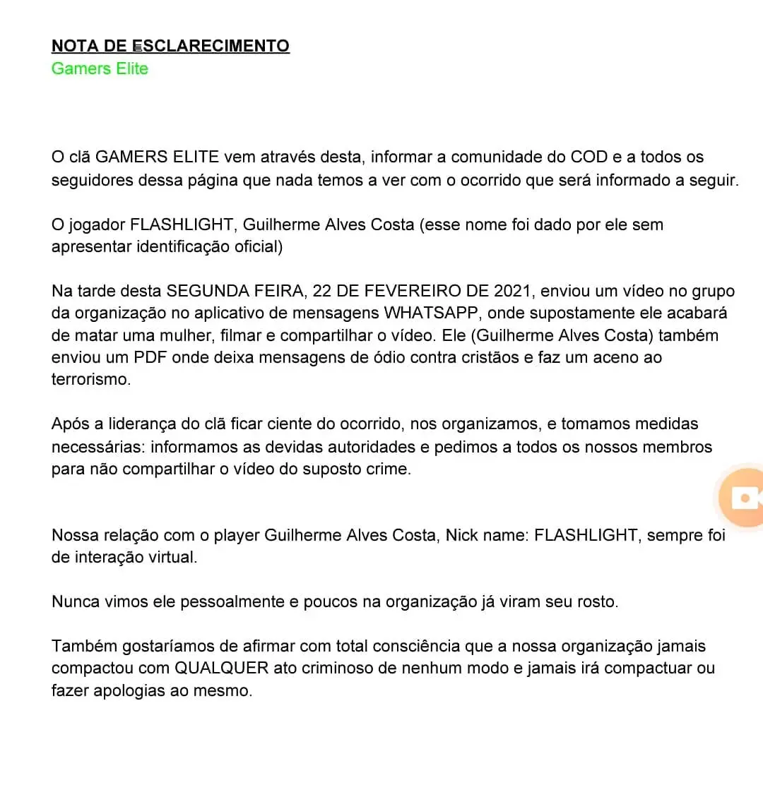 Em nota, a Gamers Elite disse que o suspeito enviou um vídeo com imagens da jovem morta no grupo da organização e os responsáveis afirmaram que informaram "as devidas autoridades" e pediram para que os integrantes do grupo não compartilhassem o vídeo. A organização diz ainda que nunca viu o jogador pessoalmente e que "não compactua com qualquer criminoso de nenhum modo e jamais irá compactuar ou fazer apologias ao mesmo".