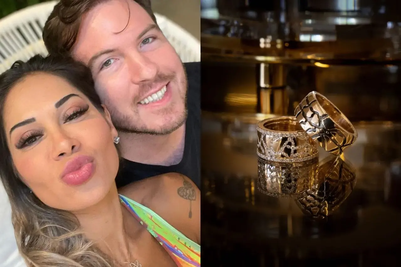 As alianças de casamento de Maíra Cardi e Thiago Nigro foram desenvolvidas pelo designer Marcello Campos e têm mais de 200 diamantes. Um detalhe, no entanto, chamou ainda mais atenção: os acessórios foram levados de carro forte para a cerimônia, que aconteceu na terça-feira (29), em segredo, em um hotel no Interior de São Paulo.