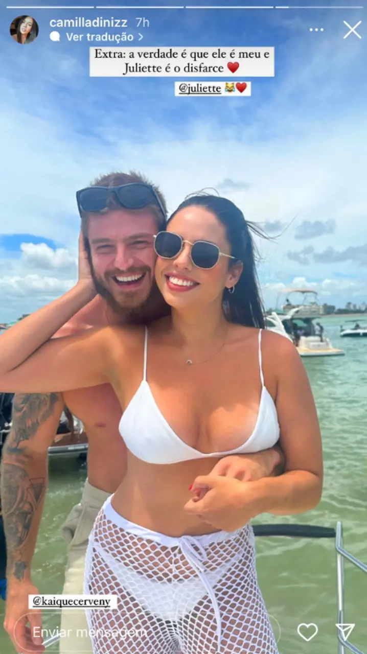 Camilla Diniz, uma das melhores amigas de Juliette, publicou nas redes sociais uma foto agarradinha com o namorado da ex-BBB, Kaique Cerveny, e fez uma piada sobre o relacionamento dos dois, que não foi bem vista pelos fãs da artista.