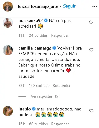 A atriz Camilla Carmargo também utilizou o Instagram para relembrar uma cena ao lado do colega no SBT. "Não consigo acreditar. Te conheci com meus nove anos e de lá pra cá foram palcos divididos, abraços, carinho, que estão eternizados. Está doendo, Lu, está doendo muito. O céu terá um dos artistas mais talentosos para abrilhantar aí em cima e a gente fica aqui na saudade", escreveu.