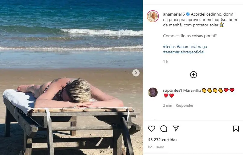 A apresentadora Ana Maria Braga resolveu mostrar nas redes sociais, nesta segunda-feira (28), que está aproveitando bastante o período de férias do 'Mais Você'. De passagem por uma praia na Bahia, ela publicou imagem cedo no Instagram tomando sol de biquíni à beira-mar.