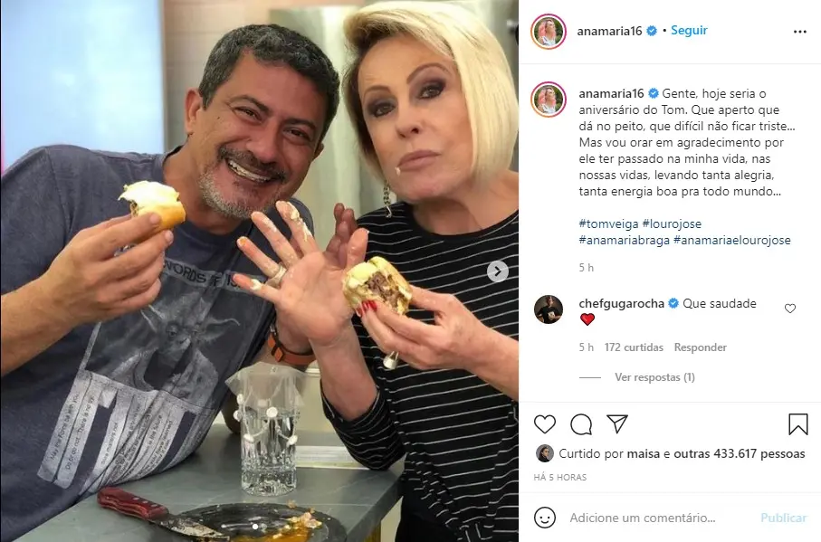 A apresentadora Ana Maria Braga, 71, homenageou Tom Veiga, o intérprete do Louro José, neste sábado (6), data em que ele completaria 48 anos. A comandante do Mais Você fez uma publicação nas redes sociais e lembrou que é difícil não ficar triste.