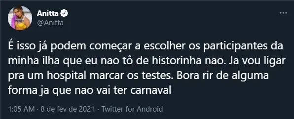 "É isso, já podem começar a escolher os participantes da minha ilha que eu não tô de historinha não. Já vou ligar para um hospital marcar os testes. Bora rir de alguma forma, já que nao vai ter carnaval", finalizou sobre a questão.