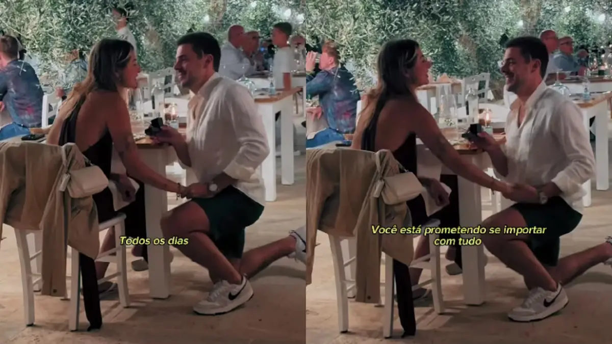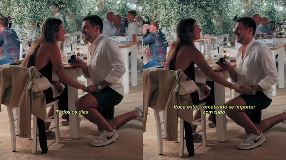 Em publicação nas redes sociais, nessa terça-feira (16), Renata compartilhou o momento especial em um restaurante. No vídeo, Ricardo se ajoelha e faz o pedido, recebendo um esperado “sim” da jornalista.