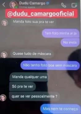 Nos prints da conversa divulgada, é possível ver a mensagem em que Dudu diz: "Manda foto sua pra te ver". A criança responde: "tem foto minha já, no Insta".