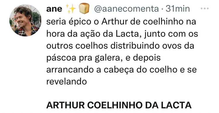 "Só vocês a essa hora para inventar o Arthur Coelhinho. Não é que a gente conseguiu? Então, amanhã ele vai entrar de coelhinho", disse.