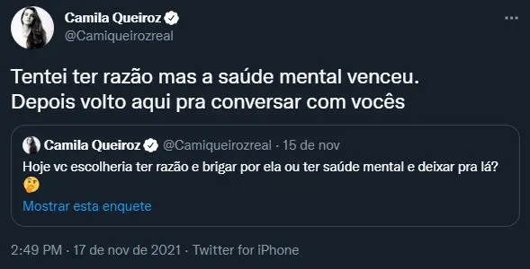 Logo após a confirmação da Globo, a atriz resolveu se pronunciar, ainda de que forma misteriosa, nas redes sociais. No Twitter, ela usou uma publicação feita no dia 15 de novembro para citar o caso.