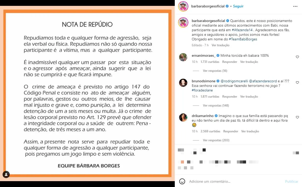 "Repudiamos qualquer toda e qualquer forma de agressão, seja verbal ou física. Repudiamos não só quando a nossa participante é a vítima, mas a qualquer participante", continuou o comunicado.