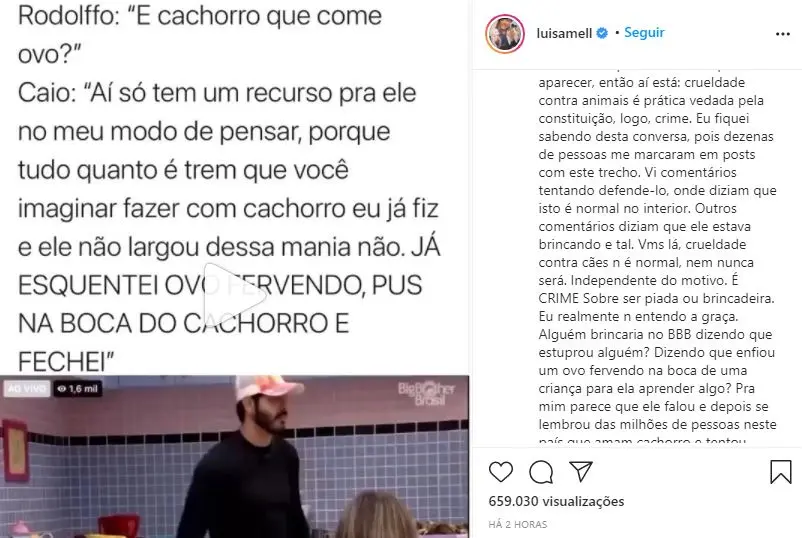 Em publicação no Instagram, Luísa Mell, conhecida pelo ativismo na área, definiu o caso como "nojento". "Se ele queria aparecer, então aí está: crueldade contra animais é prática vedada pela constituição, logo, crime", escreveu.