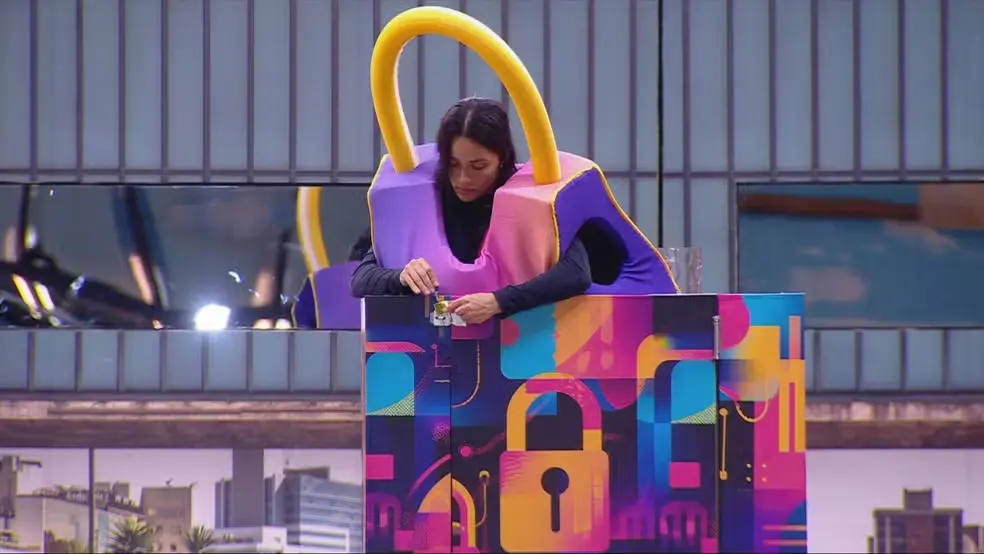 A cearense está fantasiada de cadeado. Após um sinal sonoro, ela foi até uma caixa posicionada no jardim. A bailarina só poderá sair de lá depois de encontrar a chave correta em meio a centenas de opções.