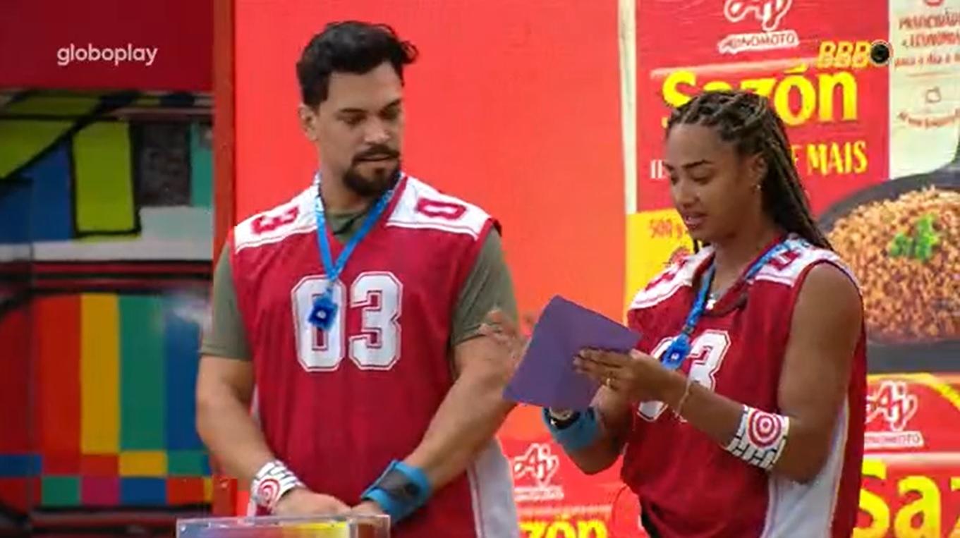 Aline e Vinícius foram a terceira dupla. Os amigos também seguiram a estratégia de dividir a busca e a montagem. Ao fim, com 1 minuto e 27 segundos, apertaram o botão e foram para dentro da casa.