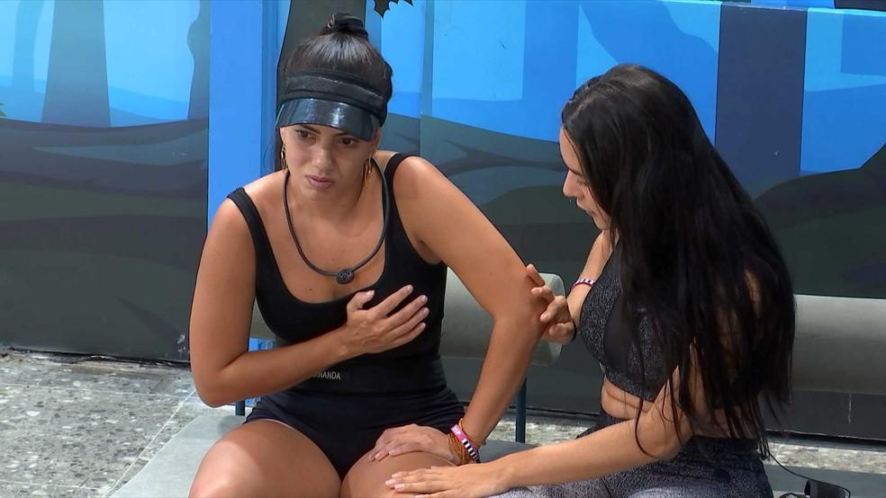 Da academia, Davi e Isabelle perceberam a confeiteira passando mal na área externa da casa. "Fernanda, está bem?", questionou a manauara. "Está sentindo o quê?", perguntou Davi. "É o coração dela. Pega um pouco de água para ela. (...) O batimento cardíaco deve estar muito rápido", avaliou a dançarina.