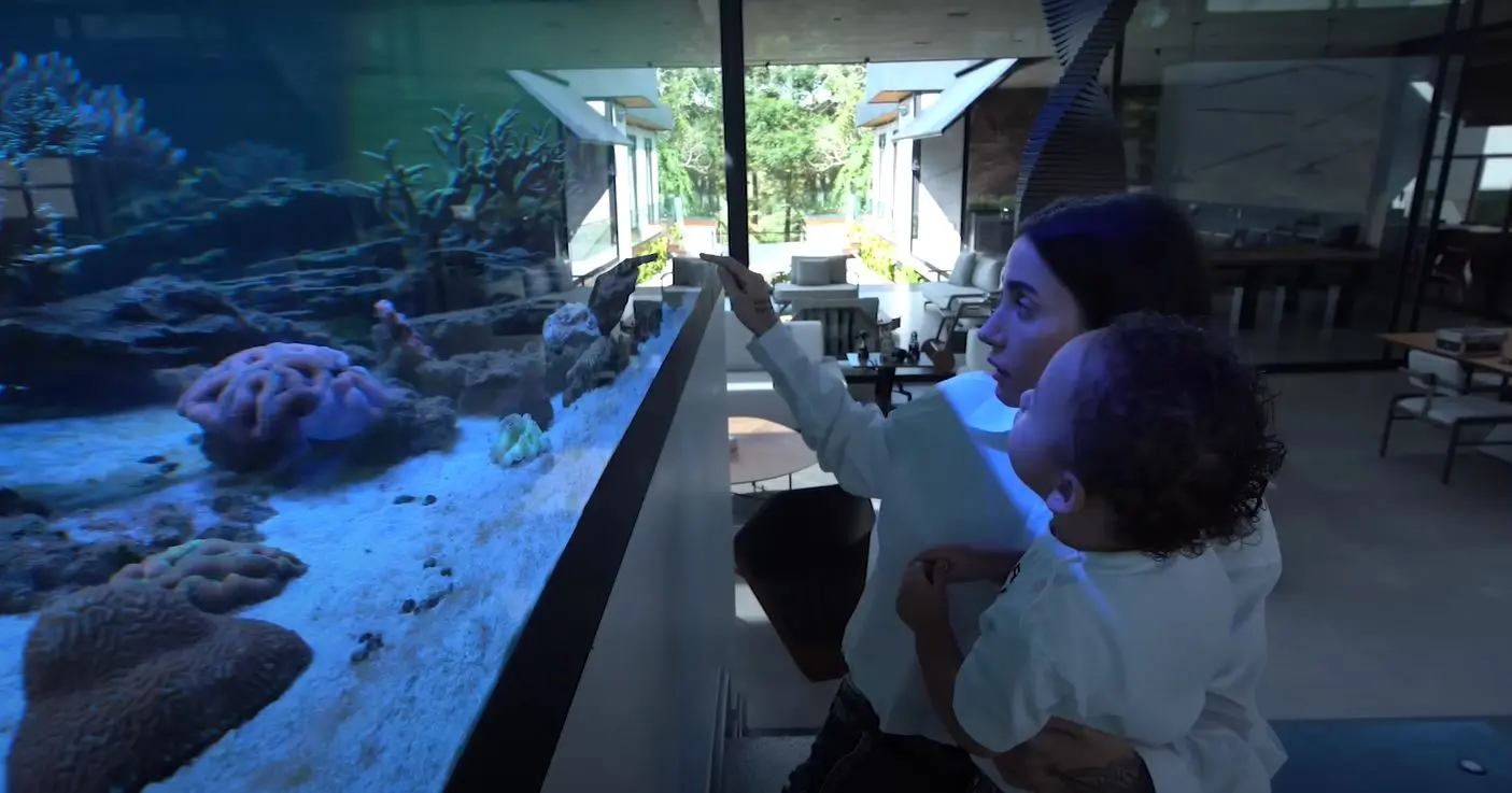 Nas imagens publicada por Bianca, é possível ver os aquários na sala de estar, e Cris, filho da influenciadora, interagindo com os peixes, além da grande área verde que existe no terreno.