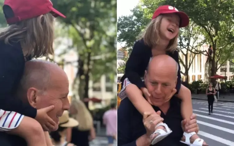 Bruce Willis aparece em novo vídeo segurando a filha nos ombros durante passeio em família; veja