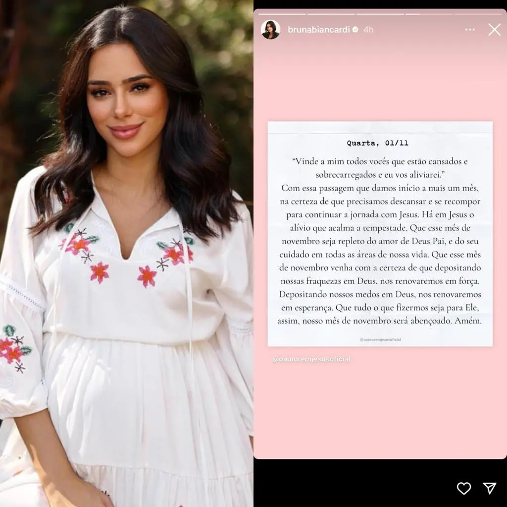 “Que esse mês de novembro venha com a certeza de que depositando nossas fraquezas em Deus, nos renovaremos em força. Depositando nossos medos em Deus, nos renovaremos em esperança. Que tudo o que fizermos seja para Ele, assim, nosso mês de novembro será abençoado. Amém”, diz a publicação, postada nos Stories, nesta quarta-feira (1º).