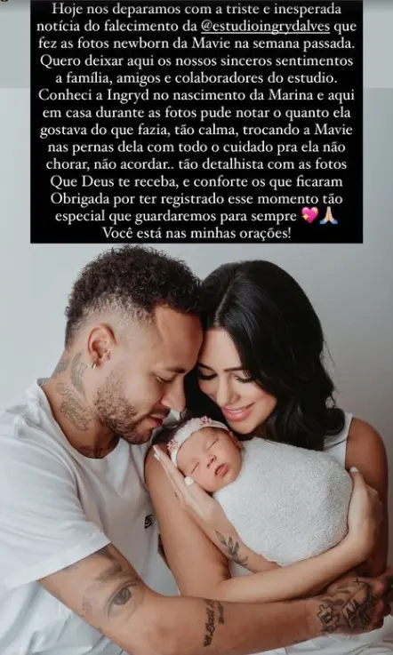 “Hoje nos deparamos com a triste e inesperada notícia do falecimento da Ingryd Alves, que fez as fotos newborn da Mavie na semana passada. Quero deixar aqui os nossos sinceros sentimentos à família, amigos e colaboradores do estúdio”, começou a morena.