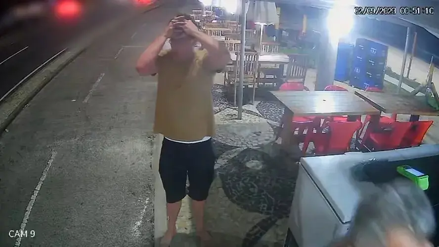 Nas imagens, divulgadas pela TV Globo, é possível observar ele saindo do quiosque onde estava com um grupo de amigos, entre eles o apresentador e ator Bruno de Luca, e atravessar a ciclovia. Então, o artista verifica o fluxo de veículos dos dois lados da avenida e segue.