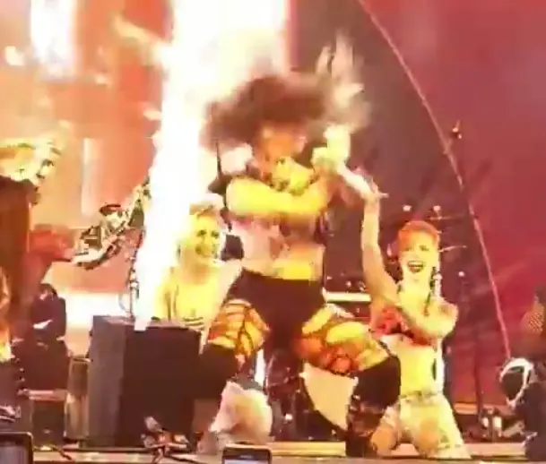 Na imagem, Amanda Araújo aparece fazendo uma performance solo 'batendo cabelo' no instante em que jatos de fogo sobem no palco. Neste momento, ainda durante a coreografia, seu cabelo aparece com mechas douradas que somem em seguida, fazendo internautas apontarem que as chamas se apagaram pelo rápido movimento de cabeça.