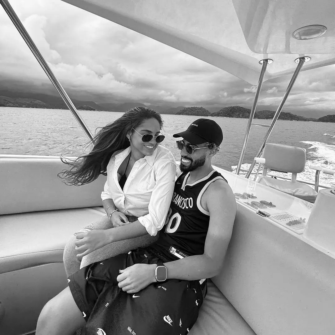 Na imagem, o casal aparece abraçado em clima descontraído em um passeio de barco.