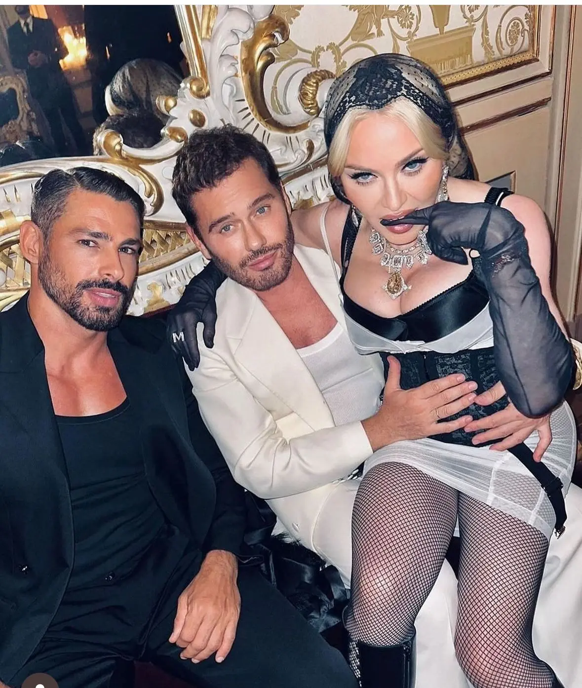 Em uma das fotos, o brasileiro aparece ao lado do fotógrafo de moda Mert Alas, que segura Madonna no colo.