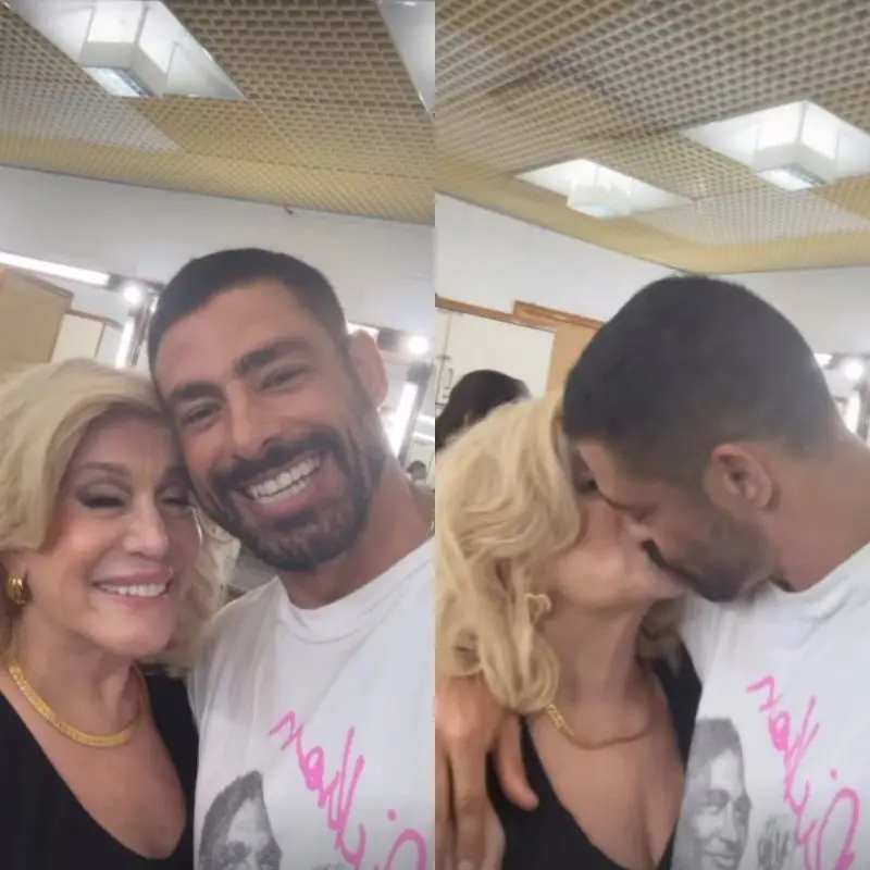 Cauã Reymond dá selinho em Susana Vieira nos bastidores de 'Vale Tudo'