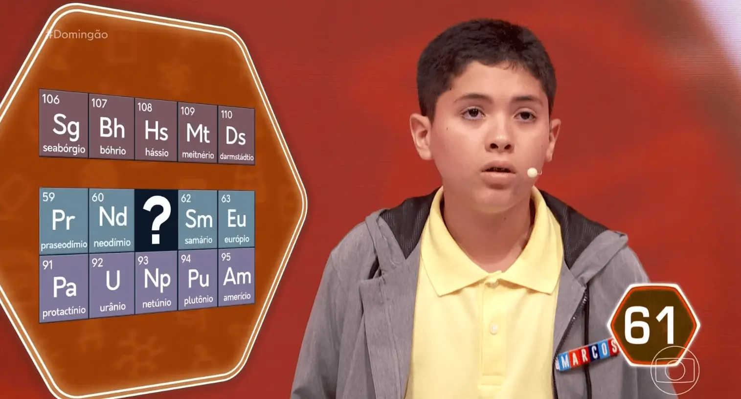 O estudante de Fortaleza, Marcos Terto, representou o Ceará no quadro "Pequenos Gênios", exibido neste domingo (20) no programa "Domingão com Huck", da TV Globo.
