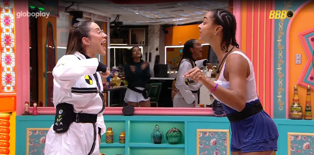 Os gritos, claro, não cessaram. "Você o tempo inteiro não quer ouvir, você não escuta o outro, não escuta a opinião que nós estamos expondo", disse Renata, apontando que, a partir de agora, não iria mais "baixar a cabeça" para a baiana.