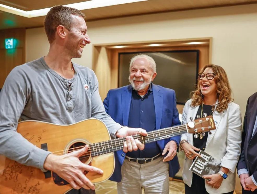 Chris Martin, líder e vocalista principal do Coldplay, falou com Lula sobre questões ambientais e proteção da Amazônia. Os britânicoas deram um violão ao presidente brasileiro.