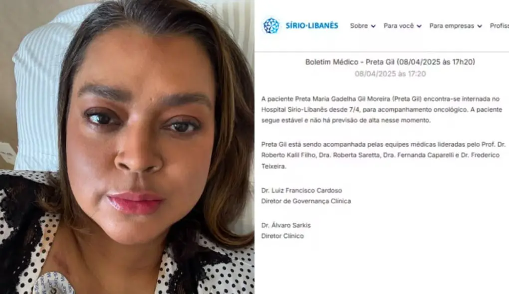 De acordo com o documento, Preta se encontra estável, mas sem previsão de alta até o momento. O boletim dá conta ainda de que a artista está sendo acompanhada por uma equipe liderada pelo médico Roberto Kalil Filho, o mesmo que faz o acompanhamento do câncer que a acomete.