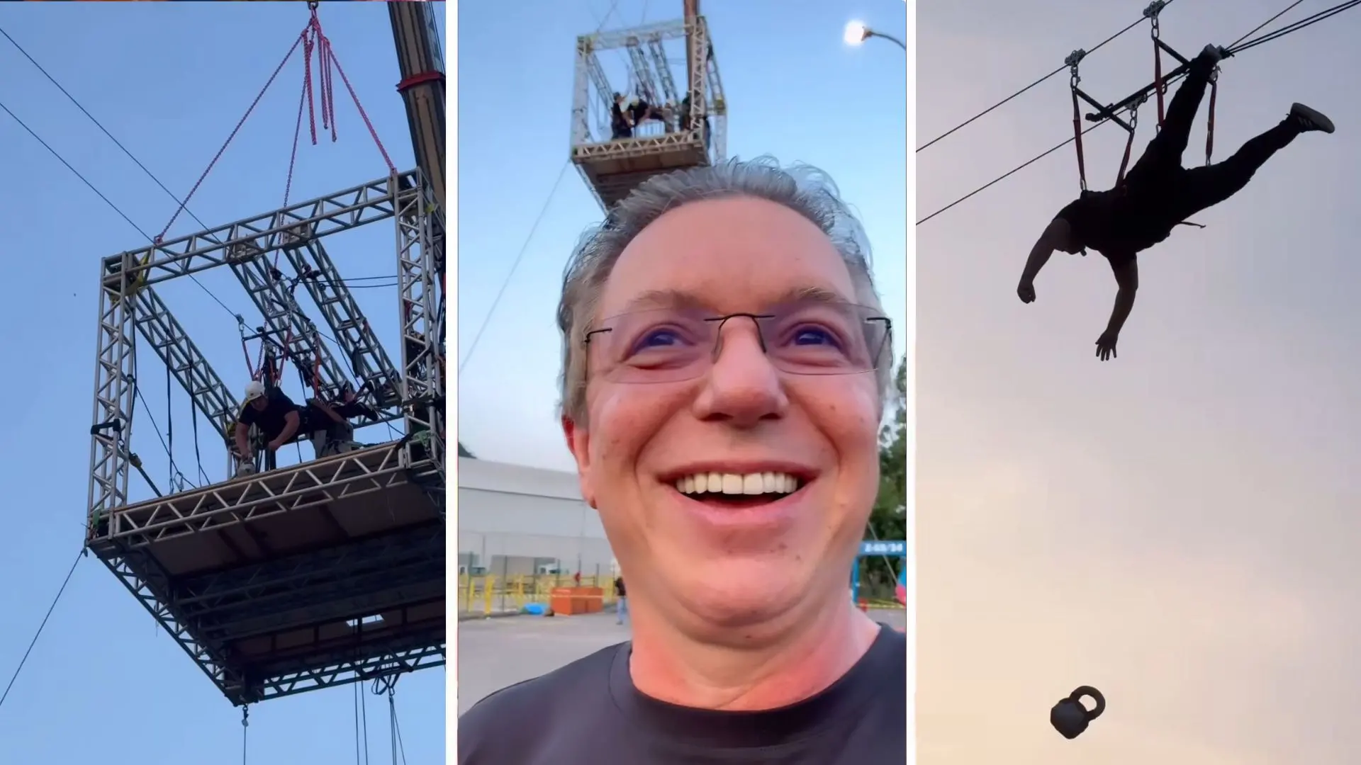 Na sequência, é possível ver o diretor do BBB, Rodrigo Dourado, fazendo um dos testes da estrutura para a dinâmica. Ele é alçado por um guindaste para chegar até a tirolesa. "Essa vai ser animada", comentou.