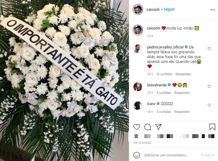 O ator Léo Rosa, que faleceu na última terça (9) por conta de um câncer, recebeu homenagem de amigos durante enterro, realizado na quinta (11) em Porto Alegre, no Rio Grande do Sul. "O importante é tá gato", dizia a coroa de flores enviada para a família do artista.
