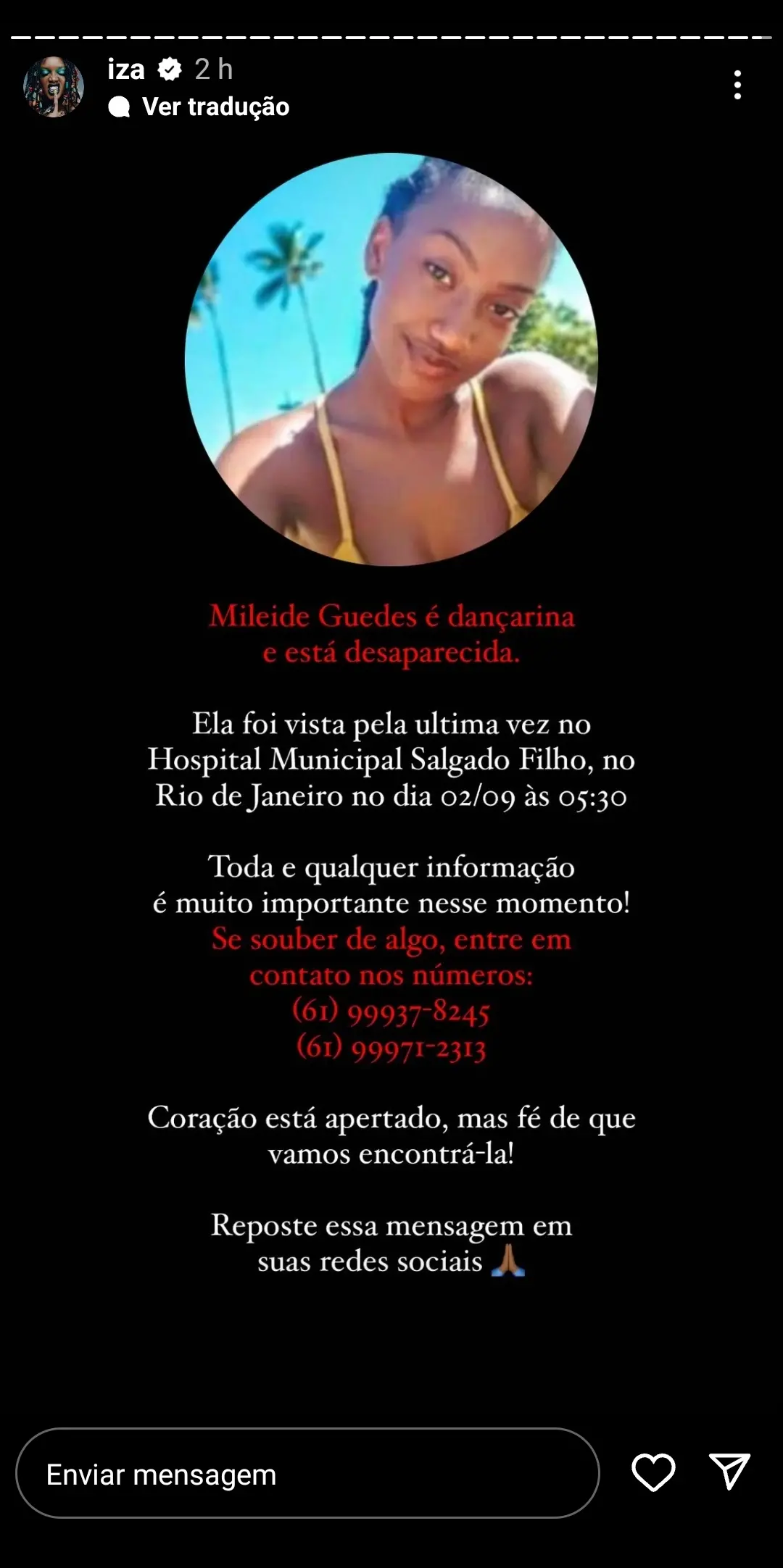 A cantora Iza compartilhou neste domingo (3) a campanha de busca pela dançarina Mileide Guedes, de 24 anos, que está desaparecida desde a quinta-feira (31). A jovem foi vista pela última vez no Hospital Salgado Filho, no Rio de Janeiro.