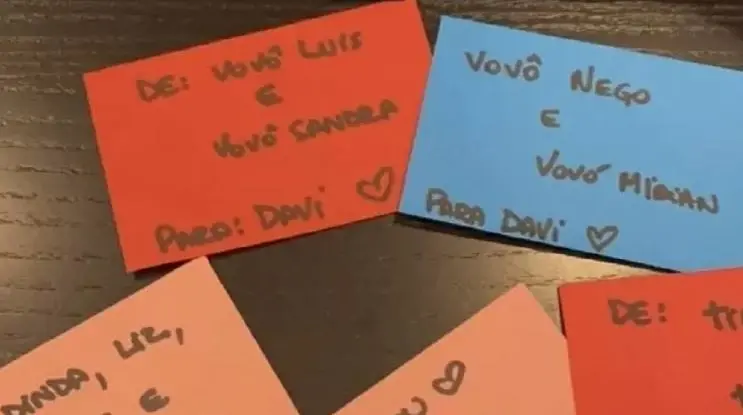 A história foi divulgada por meio de um Stories da mãe do menino, a influenciadora Carol Dantas, no Instagram. Nas imagens, é possível ver uma série de cartinhas deixadas pelos familiares endereçadas a Davi.