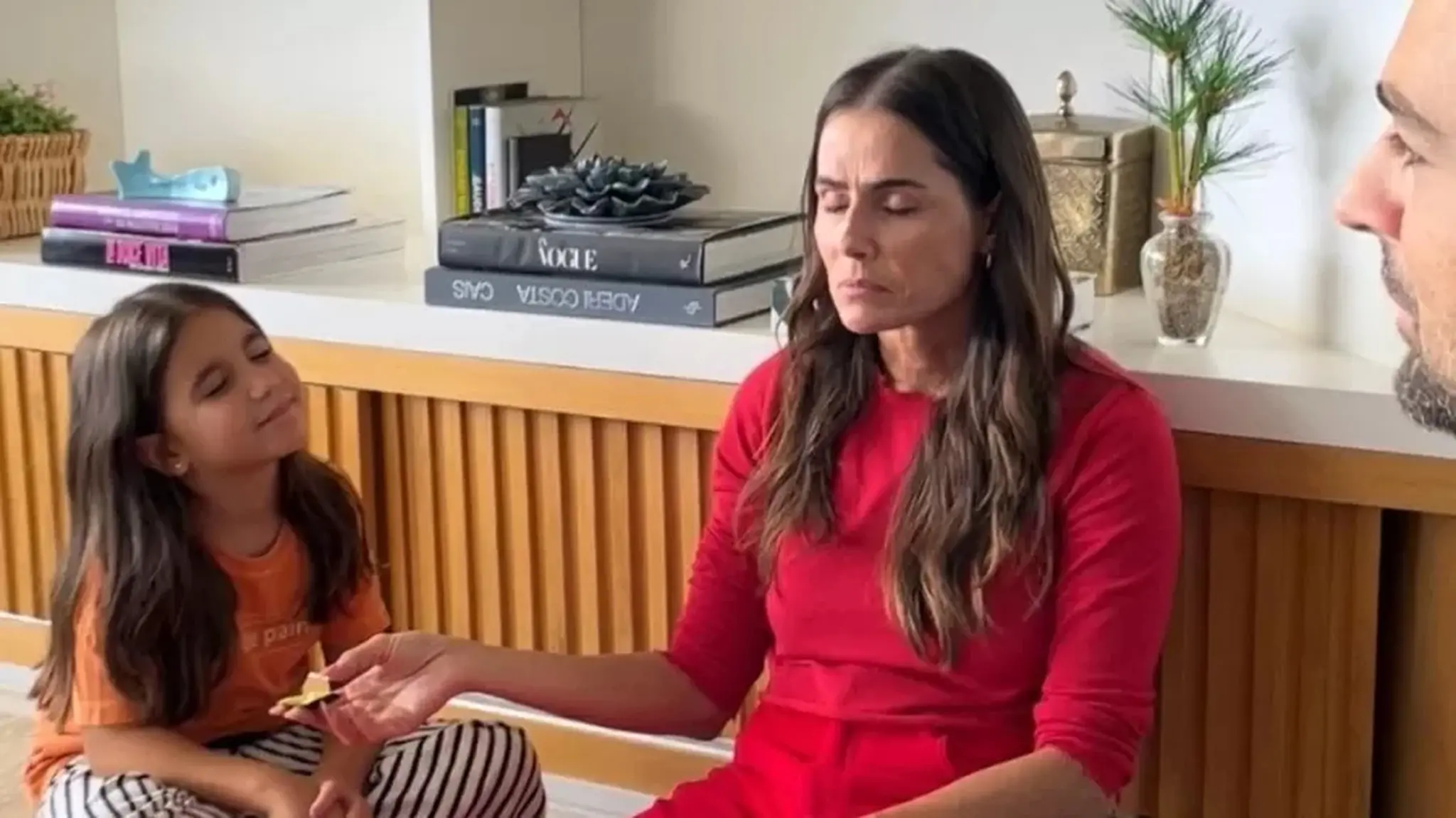 Em um vídeo compartilhado nas redes sociais do profissional, a artista aparece mastigando o fruto ao lado da filha, Maria Flor, e do marido, Hugo Moura.