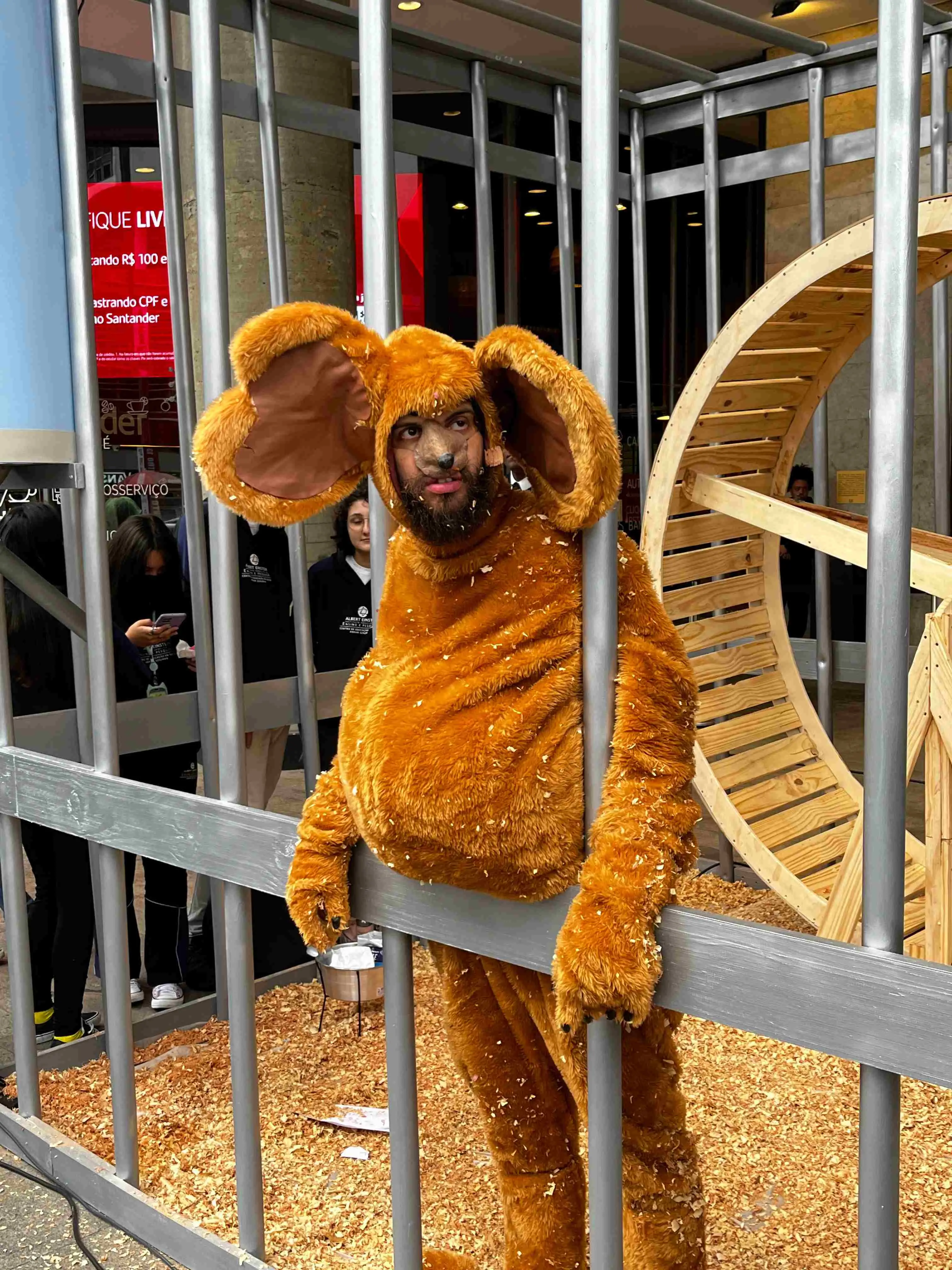 O humorista Diogo Defante surpreendeu quem o acompanha nesta quinta-feira (15), ao se vestir de hamster para fazer uma live na Avenida Paulista, em São Paulo, em uma gaiola gigante.