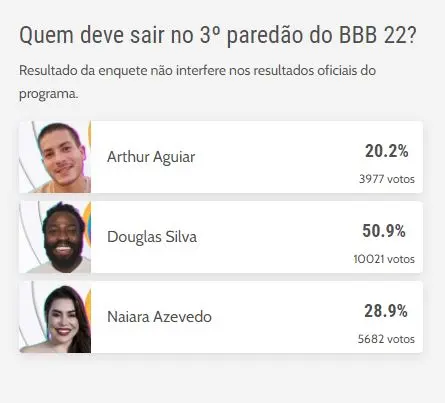 Até o fim da tarde desta segunda-feira (7), cerca de 20 mil votos foram computados na enquete. Logo depois de Douglas, o levantamento mostra, em segundo lugar, a cantora Naiara Azevedo, com 28,82%, enquanto o ator Arthur Aguiar surge em terceiro lugar, com 20,18%.