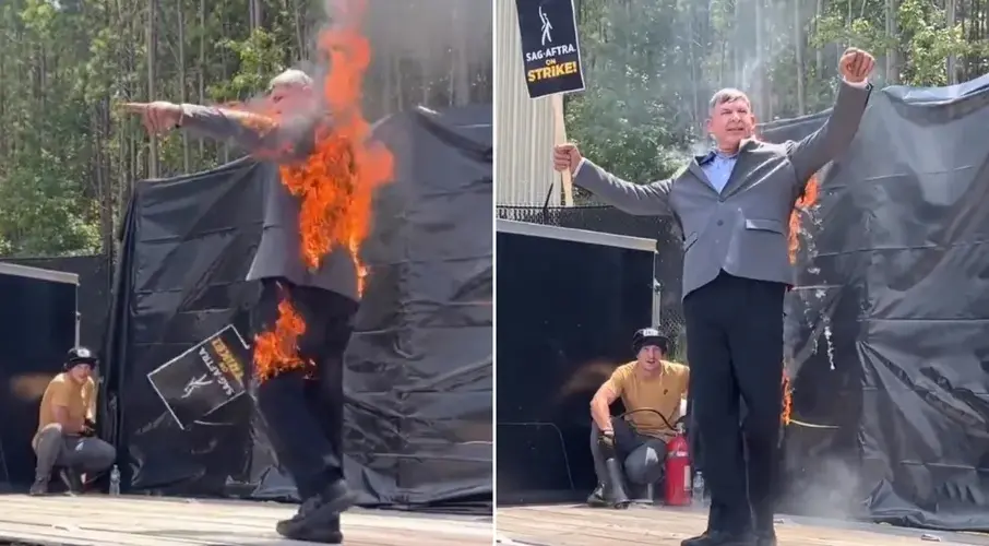 Dublê de Harrison Ford, Mike Massa coloca fogo em si mesmo para apoiar greve de atores em Hollywood
