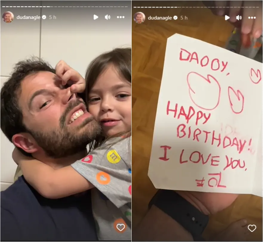 "Papai, feliz aniversário! Eu amo você", escreveu a mão, a filha de Duda em um cartão. No Instagram, o ator compartilhou a entrega do presente e ainda publicou brincadeiras com Zoe.