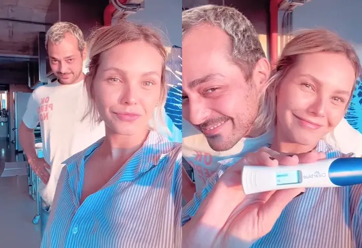 Nas redes sociais, eles postaram uma foto com o teste de gravidez positivo