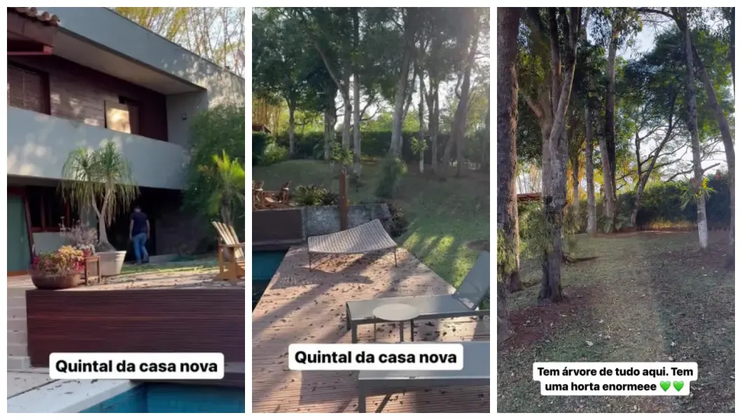 Segundo mostrado pelo empresário, a área externa do imóvel é bastante arborizada, com árvores frutíferas, hortas e animais como esquilos.