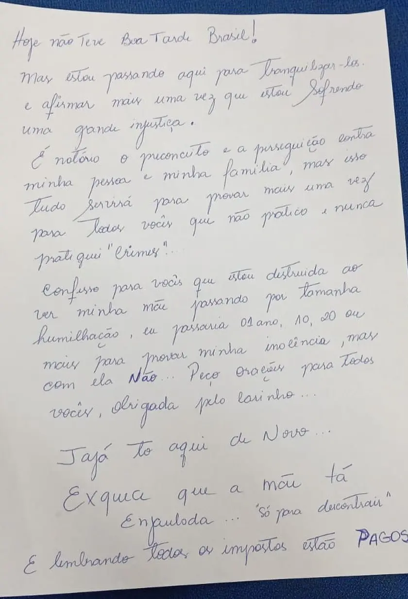 "Hoje não teve boa tarde, Brasil! Mas estou passando para tranquilizá-los e afirmar mais uma vez que estou sofrendo uma grande injustiça. É notório o preconceito e a perseguição contra minha pessoa e minha família, mas isso tudo servirá para provar mais uma vez para todos vocês que não pratico e nunca pratiquei "crimes". Confesso para vocês que estou destruída ao ver minha mãe passando por tamanha humilhação. Eu passaria 01 ano, 10, 20 ou mais para provar minha inocência, mas com ela não. Peço orações para todos vocês, obrigada pelo carinho. Já, já tô aqui de novo. Exquece que a mãe tá enjaulada... 'Só para descontrair'. E lembrando todos, os impostos estão pagos"