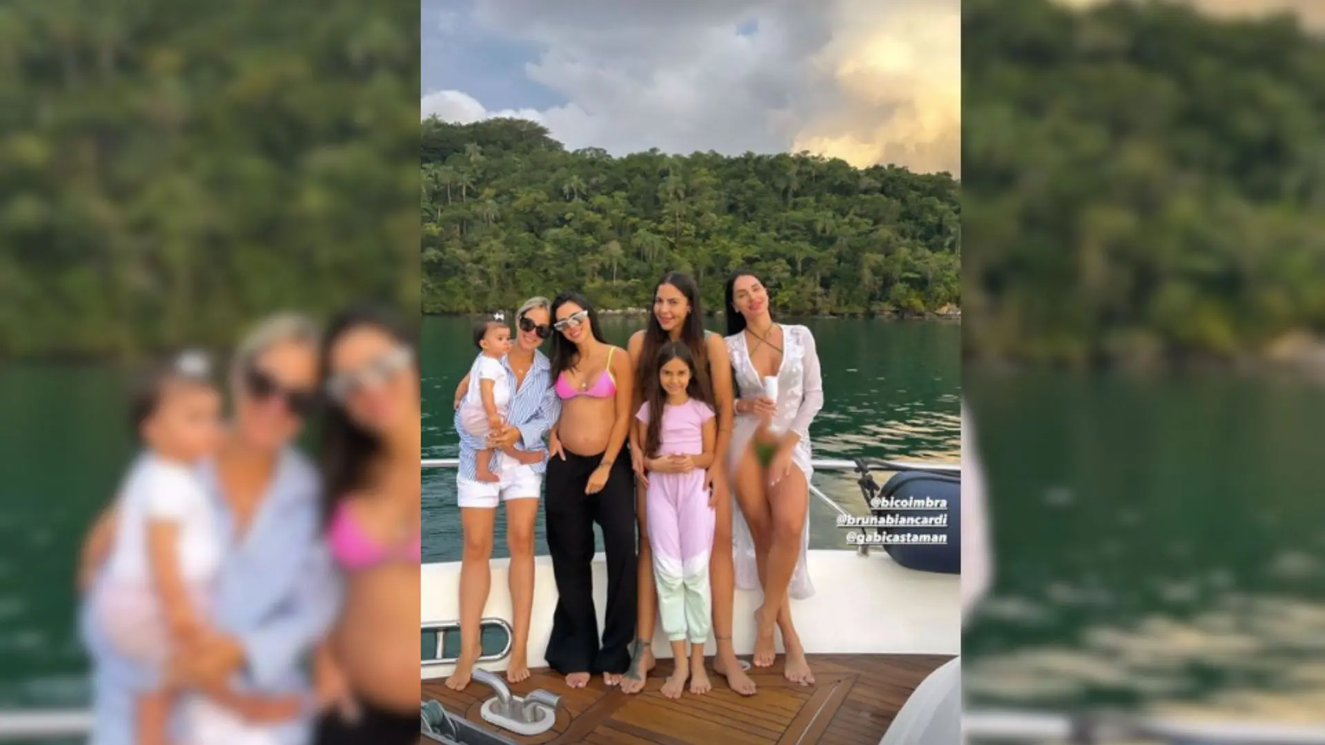 O grupo apareceu fazendo um passeio de barco, em Ilha Grande, no Rio de Janeiro, ontem. No registro compartilhado por Adenacia Anastasia, Bruna aparece de biquíni e calça, exibindo o barrigão de grávida de Mavie, primeira filha com o jogador de futebol.