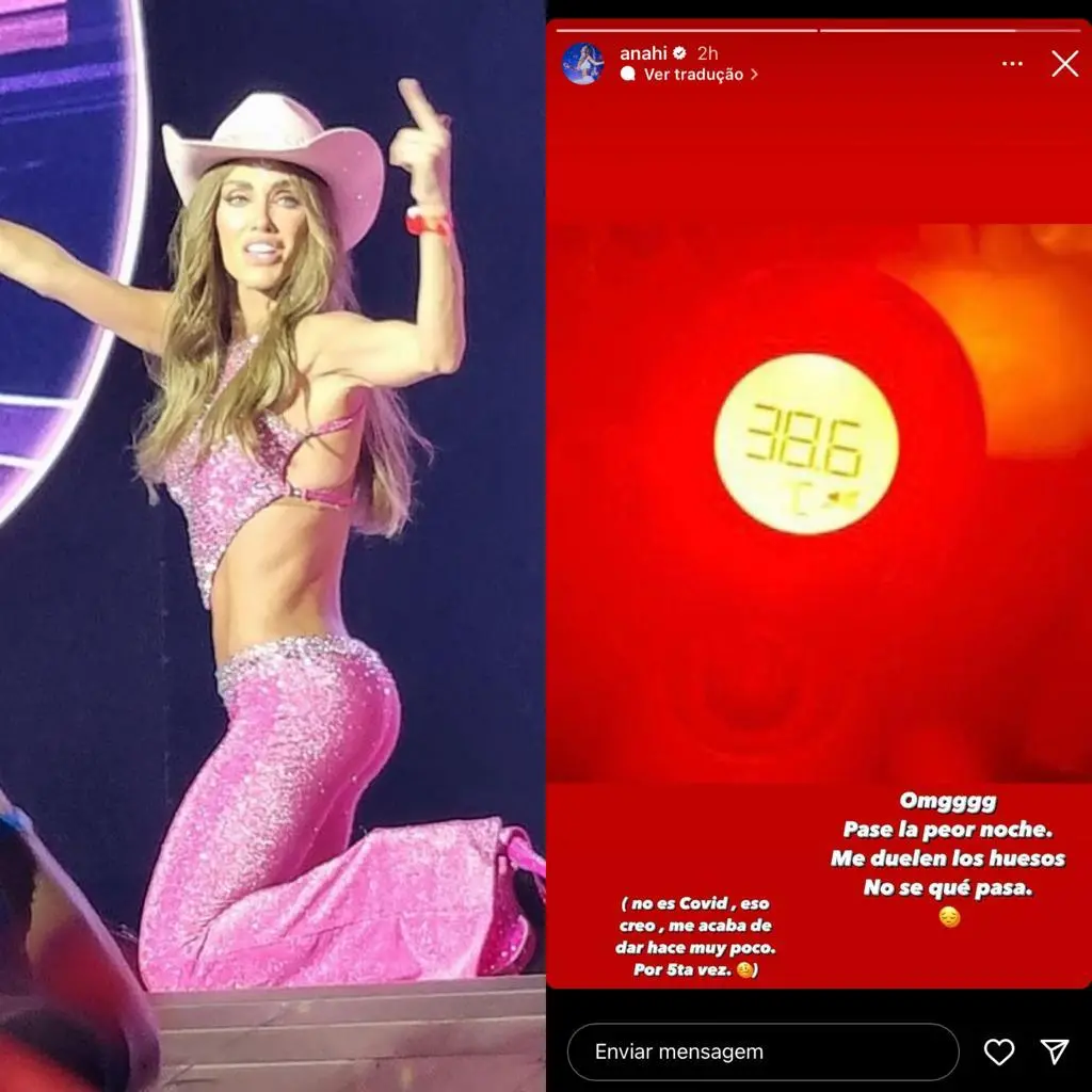 A cantora Anahi, que está em turnê com a banda RBD no Brasil, mostrou que sua noite não foi boa. Ela publicou nos Stories, na manhã desta quinta-feira (16), a foto de um termômetro marcando 38,6 graus e revelou estar sentindo dores em seu corpo.